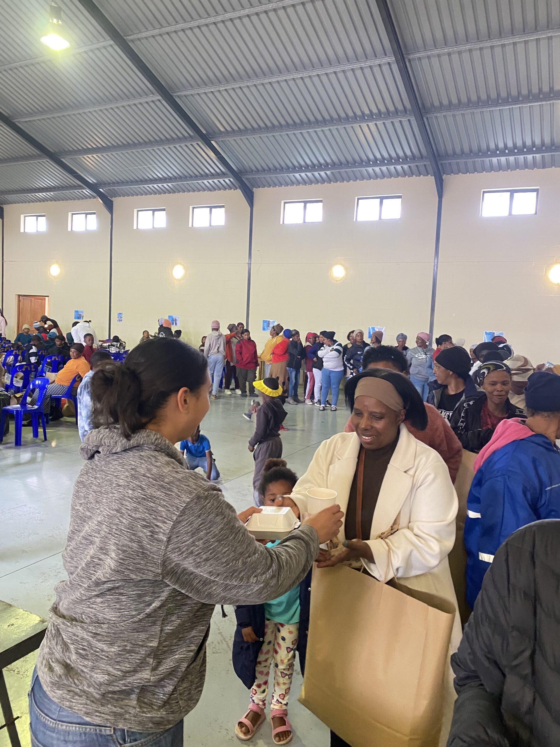 The day opened with songs, dance, and heartfelt words from our founder reflecting on 9Miles Project’s journey in Elands Bay since 2016. Partners and volunteers worked side by side with community members, laughter echoing through the hall as 77 families and more than 150 residents took part.